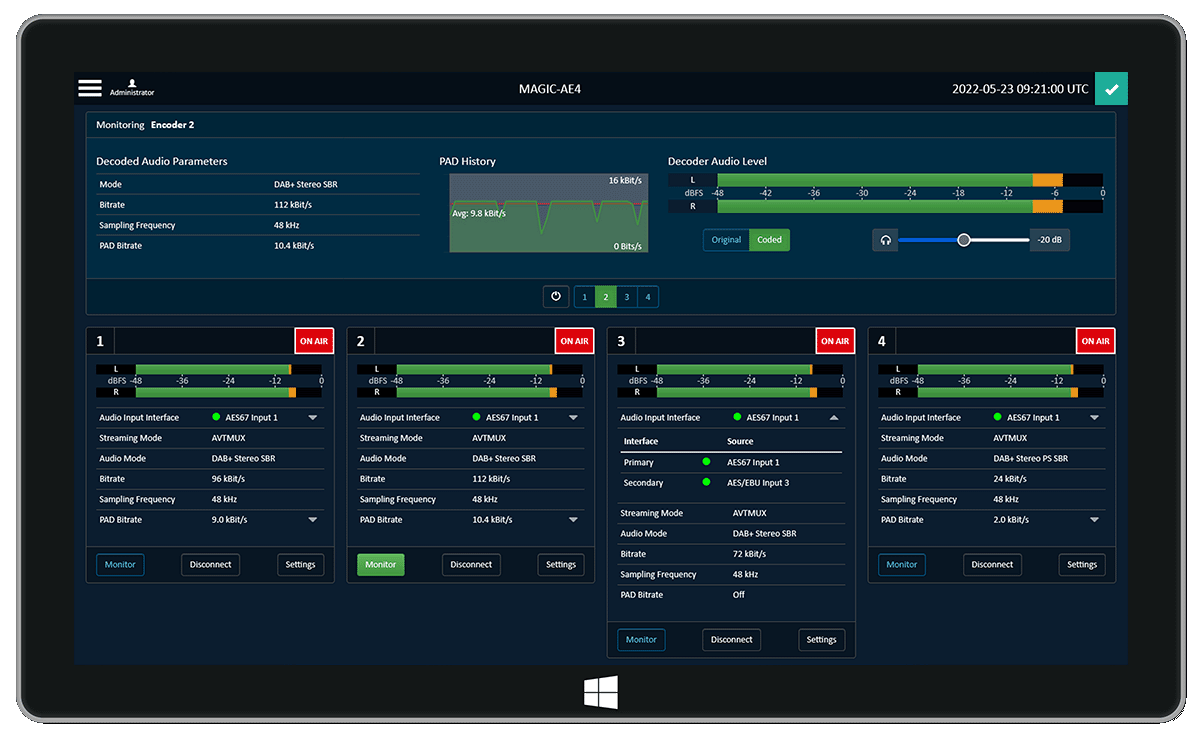 Der MAGIC AE4 DAB/DAB+ Encoder bietet in der Standardausführung einen DAB/DAB+ Hardware-Encoder und kann optional um drei weitere Encoder erweitert werden. Jeder der vier Kanäle kann unabhängig als DAB oder DAB+ Encoder konfiguriert werden.