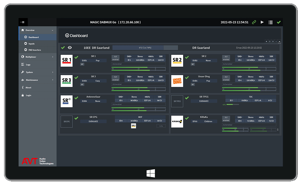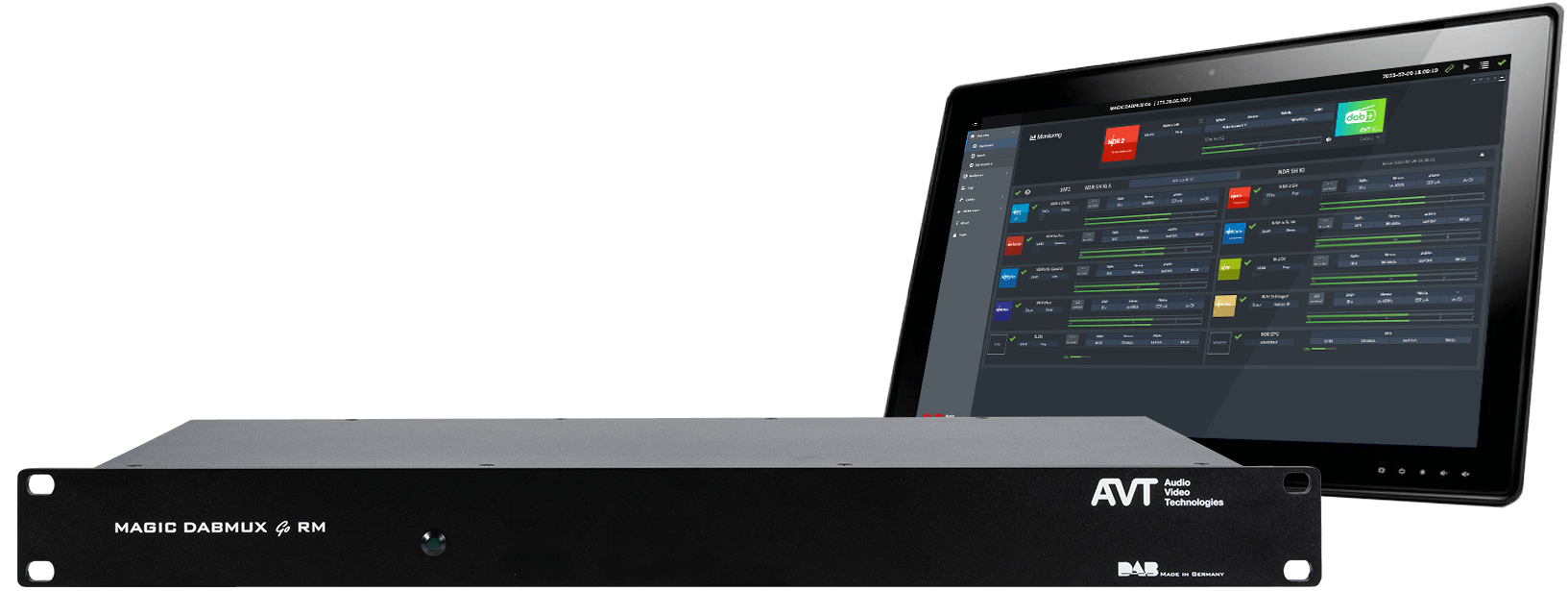 Das DAB System Manager Upgrade erlaubt die Verwaltung und Überwachung aller AVT DAB Headend Systemkomponenten über einen HTML5-fähigen Browser. Aktuell werden die Systeme MAGIC DABMUX Go und MAGIC DABMUX plus unterstützt. Die Integration des MAGIC AE1 DAB+ Go, des MAGIC AE4 DAB/DAB+ Encoders sowie die MAGIC EEC/SDC Familie erfolgt in einem späteren Release.