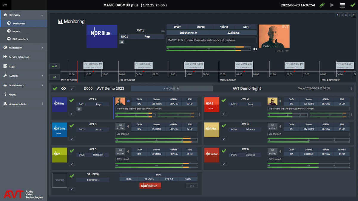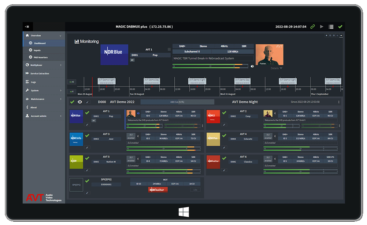 Das DAB System Manager Upgrade erlaubt die Verwaltung und Überwachung aller AVT DAB Headend System Komponenten über einen HTML5-fähigen Browser. Aktuell werden die Systeme MAGIC DABMUX Go, MAGIC DABMUX plus, MAGIC AE1 DAB+ Go und der MAGIC AE4 DAB/DAB+ Encoder unterstützt. Die Integration der MAGIC EEC/SDC Familie erfolgt in einem späteren Release.