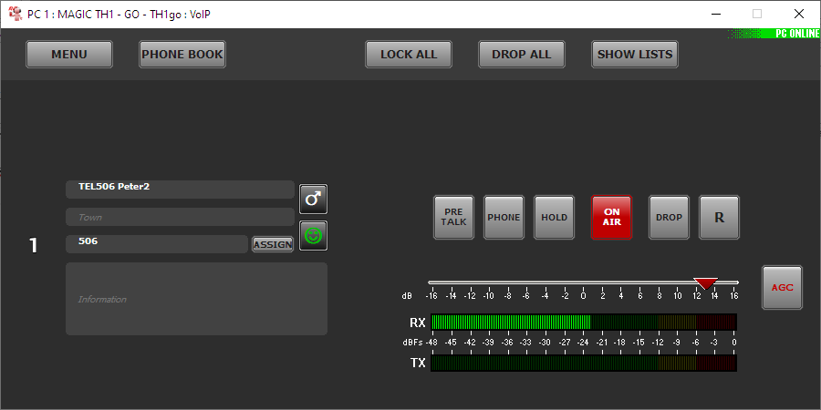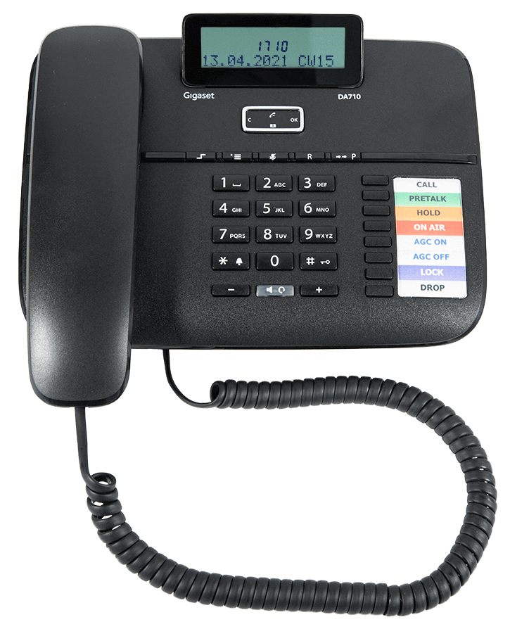 Zur Steuerung kann ein analoges Telefon an den MAGIC TH1 Go Telefonhybriden angeschlossen werden. Eingehende Anrufe können in Pretalk angenommen werden, um mit dem Anrufer ein Vorgespräch zu führen. Danach kann der Anrufer auf ON AIR oder HOLD mithilfe der Kurzwahltasten des Telefons geschaltet werden. Wenn gewünscht, kann der Anrufer auch zurück auf Pretalk gelegt werden – wieder mithilfe einer einzigen Taste am Telefon. Natürlich kann über das Telefon auch gewählt werden und ein ausgehender Anruf aufgebaut werden. Zusätzlich kann AGC (Automatic Gain Control) sowie die Funktion Voice Disguise eingeschaltet oder ausgeschaltet werden. Es kann außerdem die Anruferleitung gesperrt bzw. entsperrt.